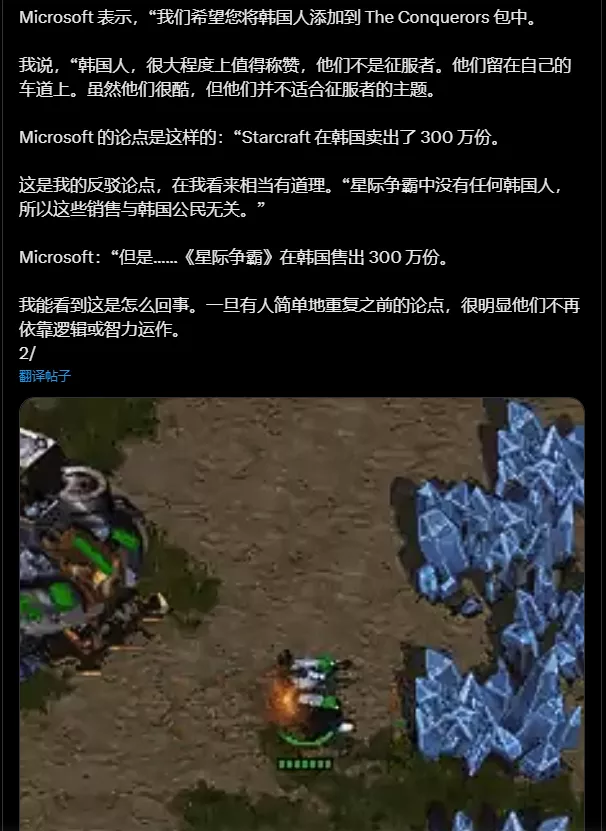 然而,他们突然接到微软的通知,要求加入“韩国”文明。Petersen认为韩国在历史上并不算征服者,虽然他们的文化很酷,但不符合“征服者入侵”的主题。对此,微软给出的理由是:“《星际争霸》在韩国卖出了300万份。”尽管Petersen坚持《星际争霸》中也没有韩国角色,微软依然坚持要求加入。