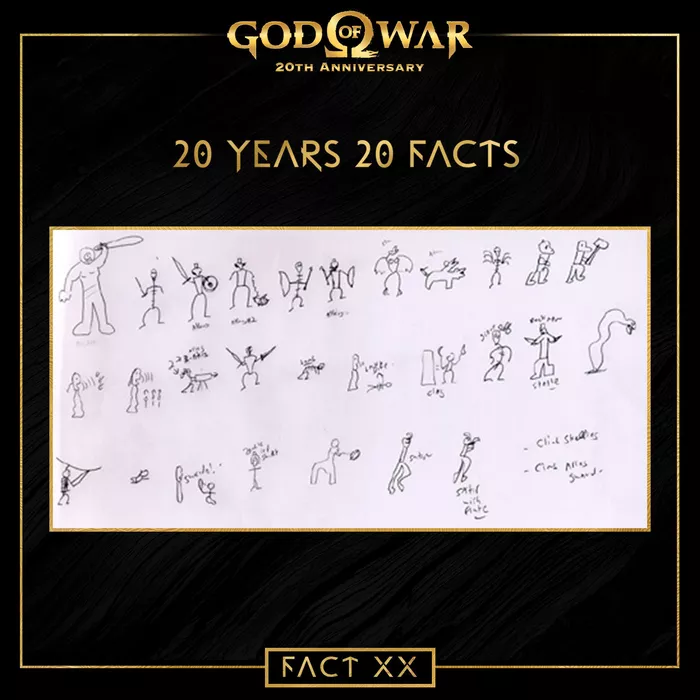 索尼经典系列游戏《战神》于昨日迎来了20周年纪念,而圣莫尼卡工作室又于今日发布了《战神》系列中所有敌人形象设计的草稿“每一个传说都有开始的地方——哪怕只是几条线和圆圈”