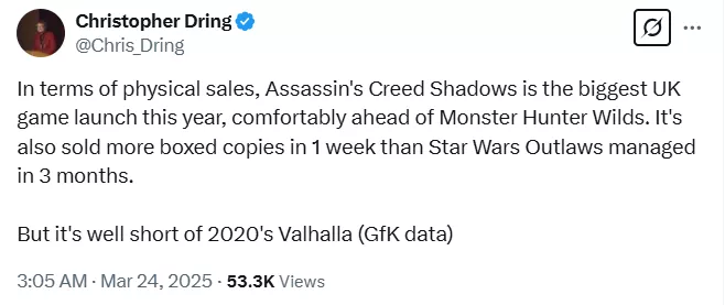 Christopher Dring表示,《刺客信条:影》一周内售出的实体版销量已超过《星球大战:法外狂徒》三个月内的总销量。不过相较于2020年发售的《刺客信条:英灵殿》,销量仍有较大差距。
