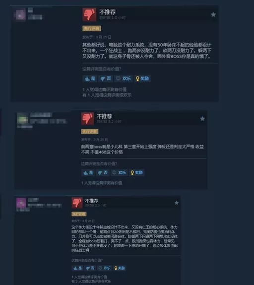 然而,也有一些玩家给出差评,主要是因为游戏的“耐力系统”设计存在问题,认为作为狂战士角色,跑两步、砍两刀、躲避两下就没有耐力了,影响了游戏体验。