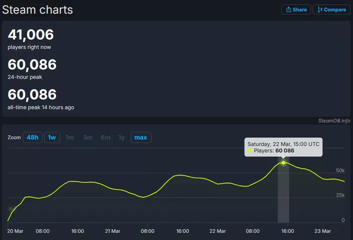 Steamdb最新数据显示,育碧旗下备受瞩目的新作《刺客信条:影(Assassins Creed Shadows)》在昨日于Steam平台上创下了佳绩,其最高在线玩家峰值成功突破6万人,具体数字达到了60086人。