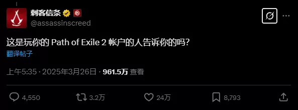 令人意外的是,育碧《刺客信条》官方账号竟在评论区犀利回击:"这是帮你代练《流放之路2》账号的人告诉你的吗?"这条神回复瞬间引爆网络,斩获超22万点赞。网友纷纷留言:"太狠了!"、"虽然不喜欢你们的游戏,但这次我站育碧"、"公关团队杀疯了"、"就冲这回复我都想买游戏了"、"这运营比育碧总部更懂怎么吸引玩家"。