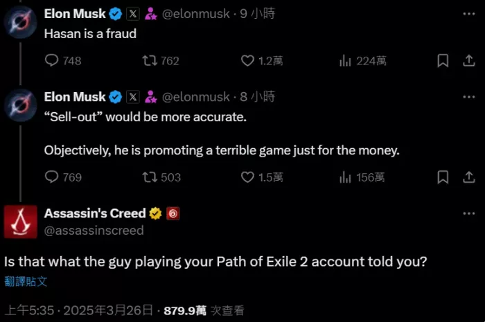 《刺客信条:影》发售后,Twitch顶流主播Hasan在BlueSky上发文宣传。当这条内容被转回X(推特)后,马斯克直接开嘲:"说’为钱出卖自己’更准确。客观来看,他就是收钱推广垃圾游戏。"
