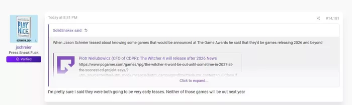 Jason Schreier在ResetEra论坛上表示,去年TGA 2024上公布的《星际:异端先知》预告片只是一个“非常早期”的版本。这意味着游戏距离正式发售还有相当长的一段时间。