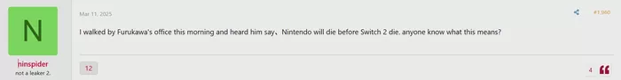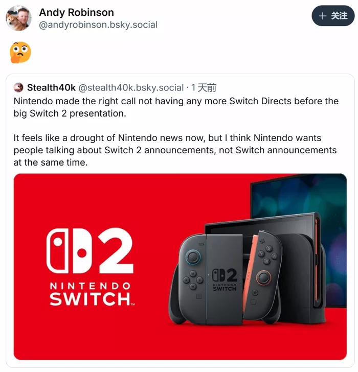 海外论坛Famiboards用户"ninspider"(去年准确泄露Switch 2设计草图)发布神秘推文,在回应"是否将举办直面会"提问时回复眨眼表情符号。