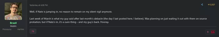 紧接着,另一位消息人士的出现进一步提升了该消息的可信度。在任天堂论坛Famiboards上,消息人士HP Brazil回复称,他的消息渠道也证实,三月“最后一周”将是任天堂下一次直面会的举办时间。鉴于此前该消息渠道曾出现过偏差,他原本不打算分享这一消息,但“既然Nate也这么说,那这事儿基本就稳了”。