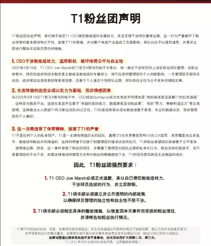 这场风波不仅引发了粉丝的强烈抗议,也让外界对T1的管理模式产生质疑。抗议粉丝团要求CEO Joe Marsh正式道歉并辞职,同时呼吁T1建立公开透明的管理制度,确保教练团队的独立性。T1将于4月4日重返赛场,届时下路首发人选的选择将成为检验这次风波结果的重要指标。