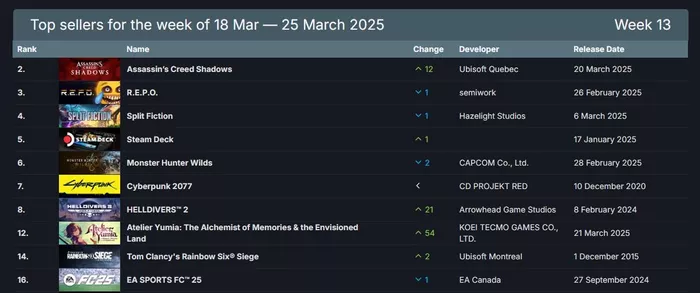 新一周Steam游戏销量榜单出炉(2025年3月18日-2025年3月26日),不包含免费游戏,育碧大作《刺客信条:影》成功登顶,恐怖合作游戏《R.E.P.O.》紧随其后,双人成行厂商新作《双影奇境》则位列第三。