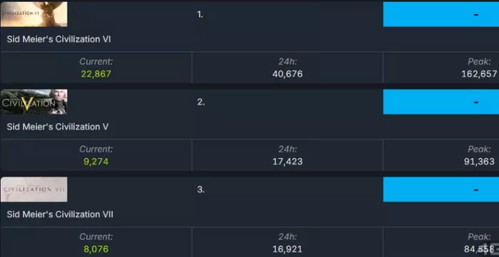 《文明7》首发时因内容不足、售价偏高而遭到老玩家诟病,特别是单调且充满廉价感的UI界面备受批评。SteamDB数据显示,其玩家数量始终不及前作《文明6》,甚至落后于15年前发售的《文明5》。部分玩家甚至不得不通过自制MOD来改善游戏体验。
