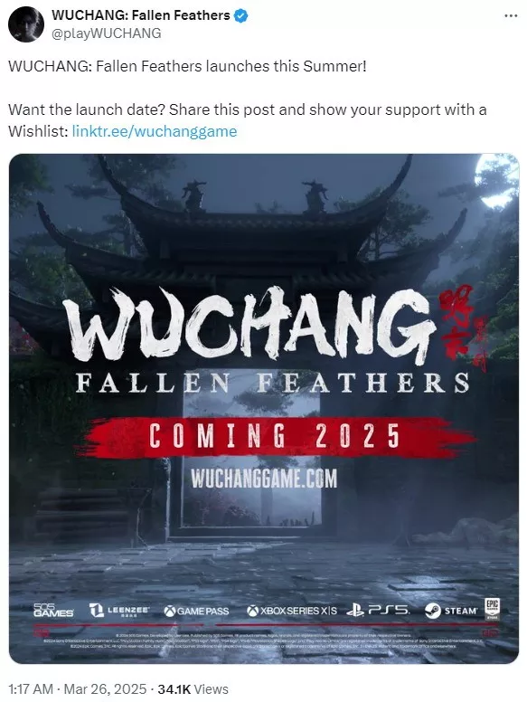 近日,505 Games正式宣布《明末:渊虚之羽(WUCHANG: Fallen Feathers)》将于2025年夏季发售,登陆PS5、XSX|S、Steam和Epic平台。官方表示:“要想知道发售日期,赶快分享此帖并把《明末:渊虚之羽》加入愿望单吧!”