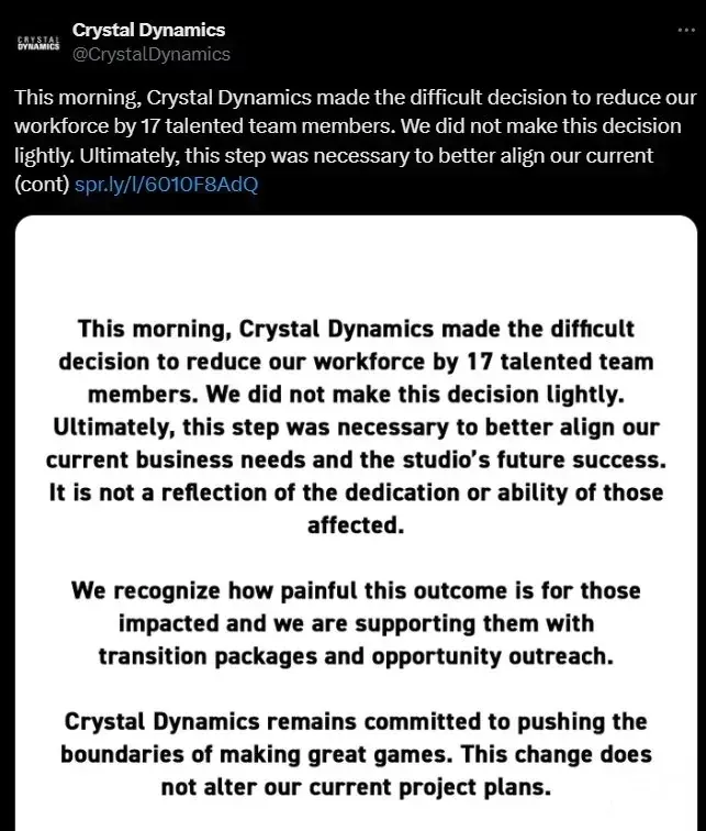 近日,知名游戏开发商 Crystal Dynamics(代表作《古墓丽影》系列)发布人事调整公告,宣布裁减17名员工。工作室在声明中强调,此次裁员是基于业务需求的结构性优化,不会影响现有游戏项目的正常开发。