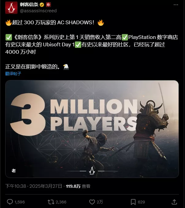 育碧新作《刺客信条:影》于3月20日发售,官方数据显示玩家数已突破300万,创下系列首日销量第二高纪录。