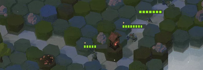 战场区域由六边形格子组成,初始被战争迷雾笼罩。玩家可逐步探索扩大战场地图,而敌人的进攻路线也会随之延长。防御设施的位置至关重要,玩家可通过木材强化地块,提升防御塔高度以扩大攻击范围。
