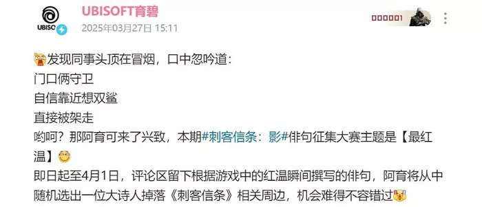 育碧中国今日发布消息,宣布《刺客信条:影(Assassins Creed Shadows)》俳句征集大赛第二期正式拉开帷幕。此次活动要求参与者依据日本俳句的文化风格,围绕【最红温】这一主题进行创作,参与者有机会赢得相关周边奖品。