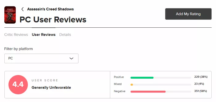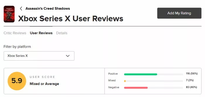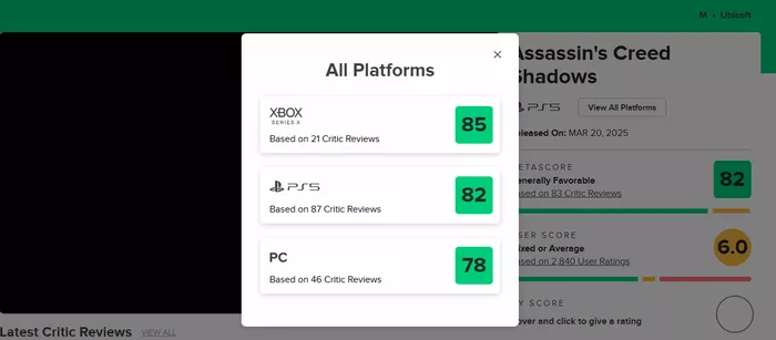 《刺客信条:影》发售一周后,各平台评分趋于稳定。据Metacritic数据显示,该作综合评分已从81分,再次涨回到了原来的82分(Xbox Series X版85分,PS5版82分,PC版78分),玩家评分为6.0分(Xbox版5.9分,PS5版6.0分,PC版4.4分)。
