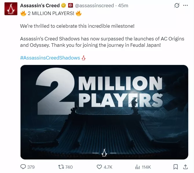 总体来看,《刺客信条:影》的市场表现不错,尽管舆论缠身,仍受到大量玩家欢迎。