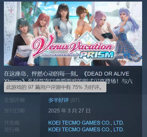 今日,光荣特库摩的恋爱模拟游戏《死或生:沙滩排球 维纳斯璀璨假期(Venus Vacation PRISM - DEAD OR ALIVE Xtreme -)》正式发售,Steam国区售价298元。截稿之前,本作Steam平台的全部评测为“多半好评”,共收录97条评测,好评率为75%。