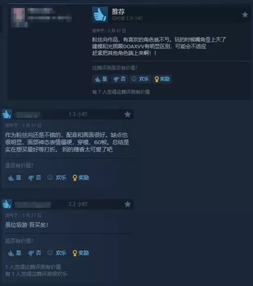 给出好评的玩家认为,《死或生:维纳斯璀璨假期》是一款优秀的粉丝向作品,能够满足前作“奶排”粉丝的期待。有玩家表示,“喜欢的角色就不亏,玩的时候笑得嘴角都歪了,期待其他角色的加入!”