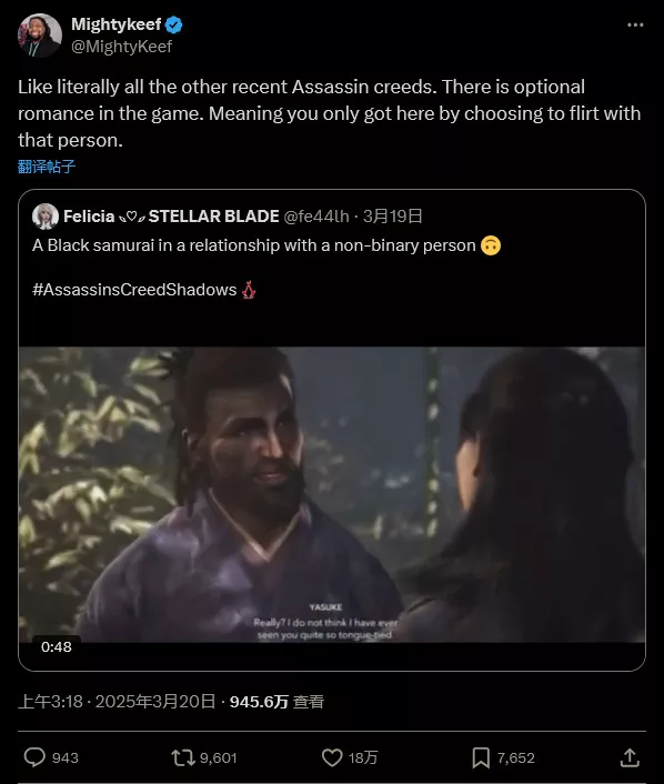 不过,也有玩家觉得这一设定并无不妥。在社交媒体推特上,一位玩家针对其他玩家发布的弥助与同性角色浪漫过场动画回应道:“这和近期其他《刺客信条》系列游戏一样,游戏里设置了可选的浪漫情节。也就是说,只有当你选择与某个角色调情时,才会出现相应的画面。”
