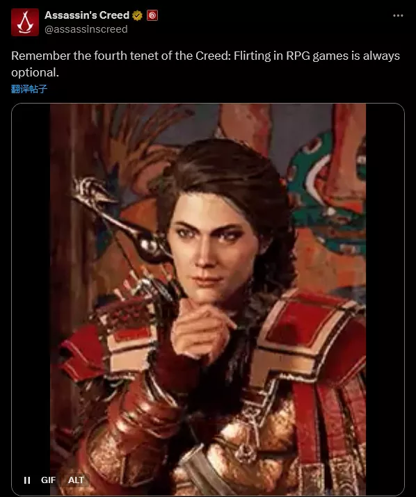 这位玩家的观点得到了《刺客信条》育碧官方社交媒体账号的支持。官方账号转发了他的评论,并提醒玩家:“别忘了(刺客的)信条中的第四信条:RPG游戏里的调情情节始终是可选的。”