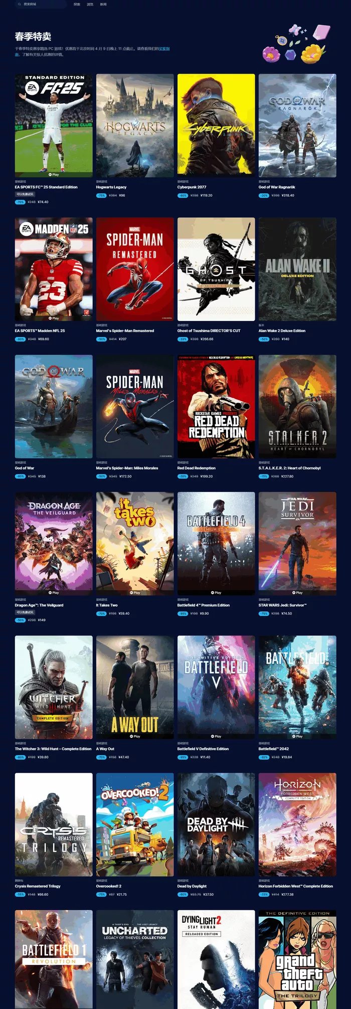 Epic Games“春季特惠”活动火热开启啦!此次促销活动将持续至4月9日晚上11点。众多在Epic平台发售的游戏作品,正以超诱人的折扣价进行销售,折扣力度最低低至2.5折,像《双人成行》《赛博朋克2077》等热门游戏都包含在内。话不多说,快来一起瞧瞧本次的游戏促销列表吧!