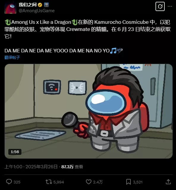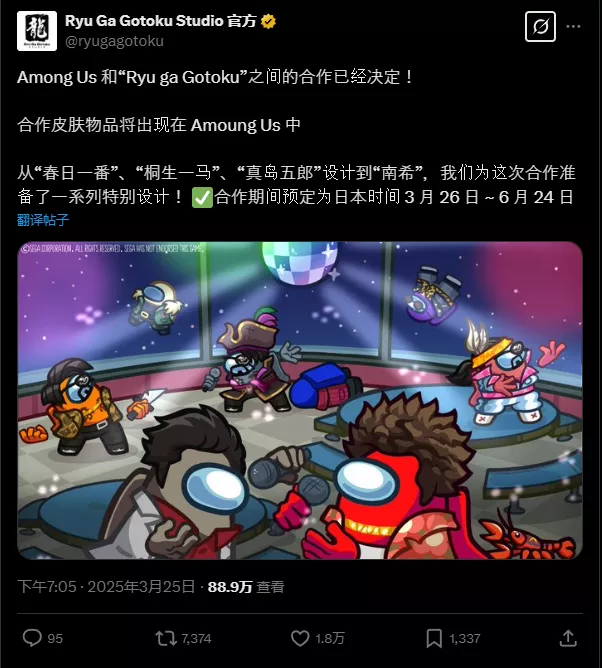此次《Among Us》×《人中之龙》联动活动将于3月26日持续至6月24日,喜欢这两款游戏的玩家可别错过!