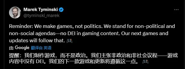 此外,他还特别强调,工作室的下一款游戏绝对不会包含DEI(多元、平等、包容)内容:“我们专注于游戏开发本身,不会涉足政治领域。我们的立场是保持游戏内容的纯粹性,不涉及任何政治或社会议题——游戏中不会包含DEI相关内容。未来的游戏以及更新都将遵循这一原则。”