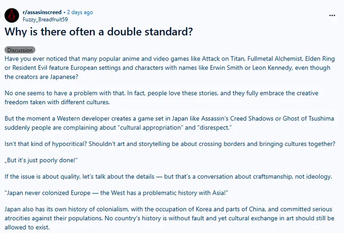 《刺客信条:影(Assassins Creed Shadows)》因黑人男主饱受玩家争议,上线至今一直被玩家指责不尊重日本历史。近日,国外网友在Reddit论坛发文力挺本作,并内涵道,现在存在双标的人太多了。