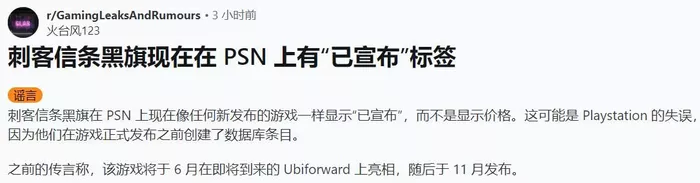 根据PSN商店的信息,《刺客信条4:黑旗》并未显示售价,而是像其他尚未发布的游戏一样标注为“已公告”。这可能是索尼的失误,在游戏发售前提前录入数据库。