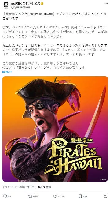 世嘉昨日通过《如龙》工作室官方社交媒体账号发布公告,针对《如龙8外传:夏威夷海盗》中的“金珠”故障问题向玩家发出警告,建议暂时避免购买该道具。