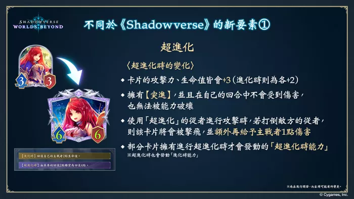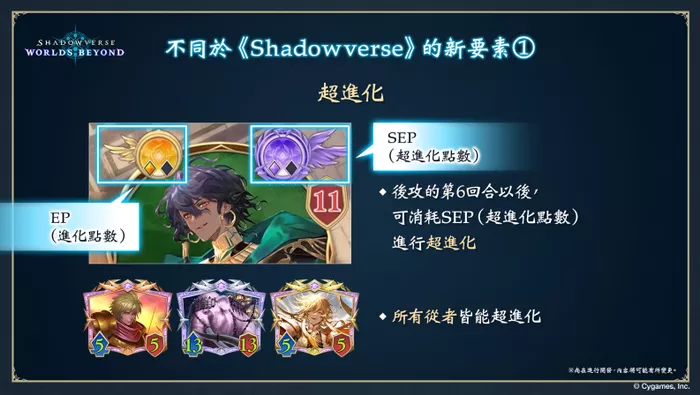 超进化:与普通进化不同,超进化使用“SEP”(超进化点数)来强化卡片。所有从者无论稀有度均可进行超进化,超进化后的从者攻击力和生命值各增加3点,并拥有【突进】效果,还能在自己的回合中将受到的伤害归零,且无法被能力破坏。更酷的是,超进化后的从者击败敌方从者时,敌方从者会被击飞并撞击主战者,造成额外1点伤害。