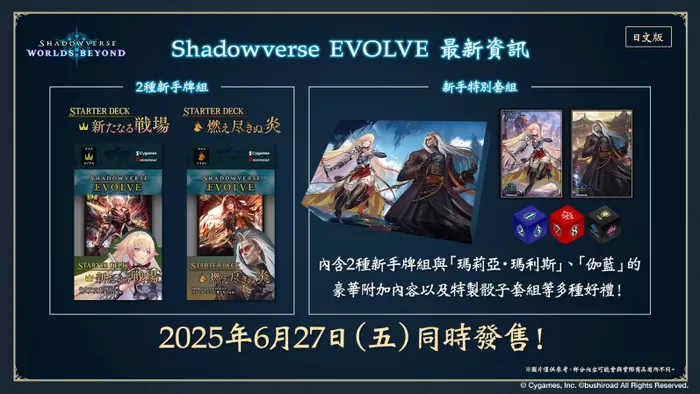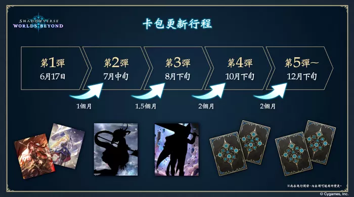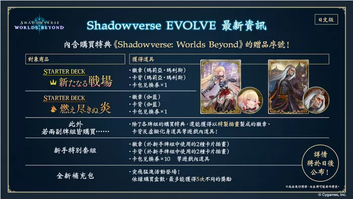 《Shadowverse: Worlds Beyond》第1弹卡包将同步登陆日文版实体卡牌游戏《Shadowverse EVOLVE》。7月11日发售的全新补充包将包含“毅勇的堕天使‧奥莉薇”等新卡,6月27日还将推出两副新手牌组和特别套组,帮助新玩家快速上手。