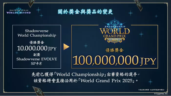 为纪念《Shadowverse: Worlds Beyond》上线,2025年将举办特别国际赛事“Shadowverse World Grand Prix 2025”,优胜奖金高达1亿日元!赛事详情将在后续公布。