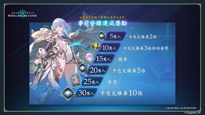 官方表示,将根据预注册人数在游戏上线时赠送全体玩家游戏内道具。若累计达成30万人,玩家将获得合计20包卡包兑换券与金币等奖励。