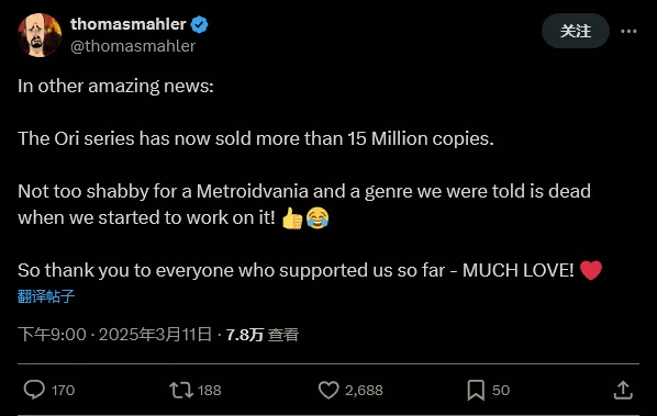 Thomas Mahler表示,《奥日》系列目前已售出1500万份。对于一款类银河恶魔城游戏来说,这个成绩相当不错。记得在我们开始制作时,有人告诉我们这个游戏类型已经死了。因此,我要特别感谢迄今为止一直支持我们的所有玩家——非常感谢你们。