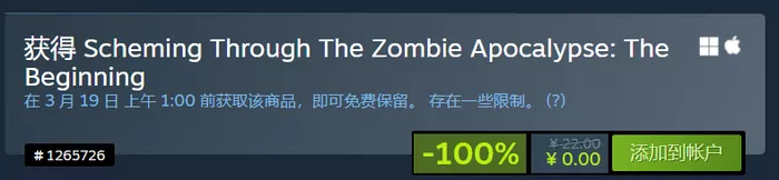 今日,随着Steam春促活动开放,多款游戏迎来了新史低。同时也有游戏可免费获取,如《穿越僵尸启示录:开始(Scheming Through The Zombie Apocalypse: The Beginning)》,在3月19日01:00前直接入库本作,便可免费游玩,游戏原价22元。