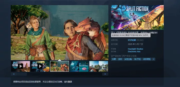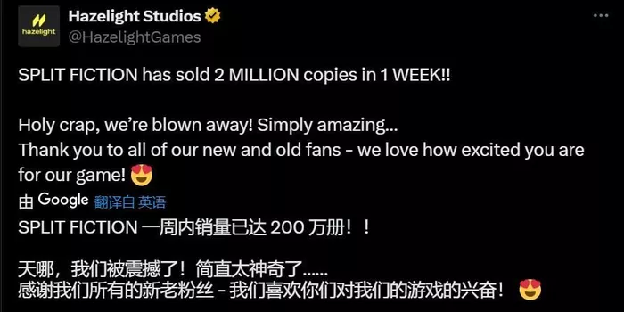 《双人成行》团队新作《双影奇境》发售后48小时内,销量就突破了100万份,而就在昨晚(3月13日)23点,开发商Hazelight Studios在推特发文宣布本作在发售一周后,全球总销量已突破200万份!