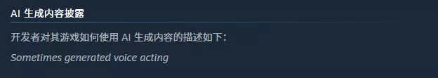 《秘密城堡》Steam页面的描述中有标注AI生成内容声明中承认游戏有时会使用AI生成配音,但根据Nerida的说法,这个声明是在招聘配音演员之前就发布的。