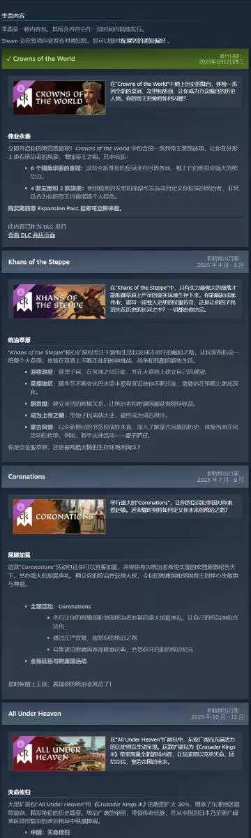 第四个扩展内容「溥天之下」预计10-12月推出,包含整个东亚地区,包括天朝体制下的中华帝国,日本列岛和朝鲜半岛以及印度尼西亚群岛。