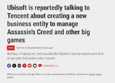 去年就有报道称,因财务问题而股价暴跌的育碧正在考虑出售部分股权,当时第一大股东Guillemot 家族和第二大股东腾讯都考虑全面收购该公司,但育碧最终没有对此事进行表态,只提到“会定期审查所有战略选择,以维护股东的利益”。