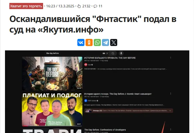 根据80 Level的报道,Yakutia.Info因两篇新闻文章被Fntastic起诉。其中一篇文章将《浩劫前夕》称为“诈骗”(scam),另一篇文章则引用了其他YouTuber的视频,指出《浩劫前夕》的许多游戏机制都是借鉴其他游戏的。