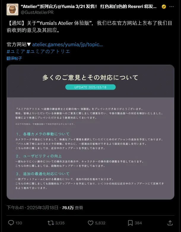 《炼金工房》系列新作《优米雅的炼金工房~追忆之炼金术士与幻创之地~》于上周日推出了可继承至正式版的体验版。许多玩家在试玩后反馈了一些游戏中的问题。