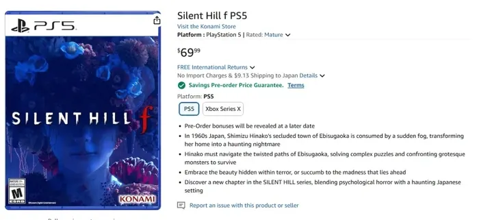 此外,IGN报道称,包括亚马逊、Best Buy和GameStop在内的多家知名零售商已开启《寂静岭F》PS5和Xbox版本的预购,价格同样为69.99美元。