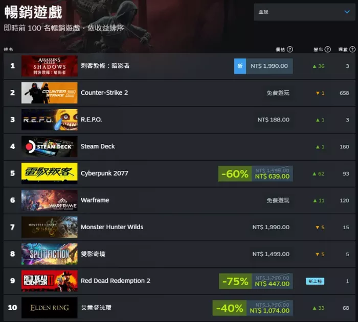 根据本文撰写时的Steam数据显示,《刺客信条:影》已登上全球畅销榜榜首,超越了常年热门的免费游戏《CS2》以及近期大热的团队新作《R.E.P.O.》。在不同地区的畅销排名中,国内位列第4名,美国第1名,日本第4名,整体表现相当亮眼。Steam平日在线人数也突破了2.4万人,周末是否能继续增长值得期待。