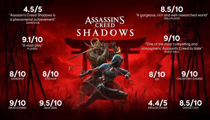 今日,育碧大作《刺客信条:影(Assassins Creed Shadows)》正式发售,目前已取得了多项令人瞩目的成绩。育碧ANZ在社交媒体上晒出本作的媒体赞誉图,展示了多家知名媒体的高分评价。