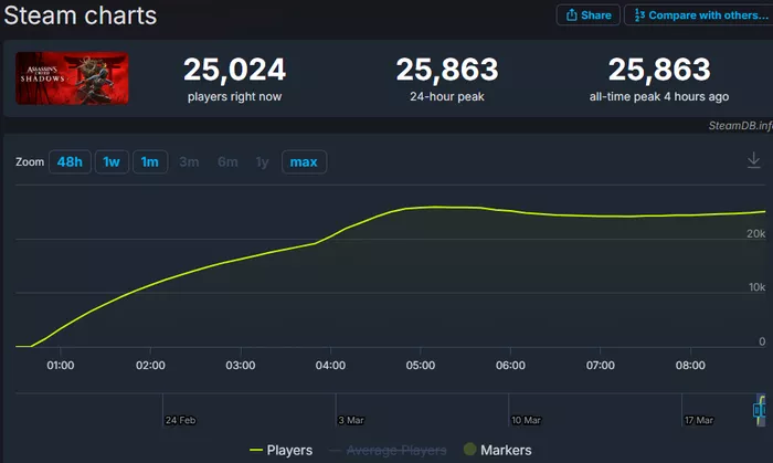 据SteamDB数据显示,《刺客信条:影》在Steam平台的历史在线峰值突破了2.5万人,且这一数字仍在持续增长。此外,本作已登上Steam全球热销商品榜单第一位,超过了《CS2》和Steam Deck。