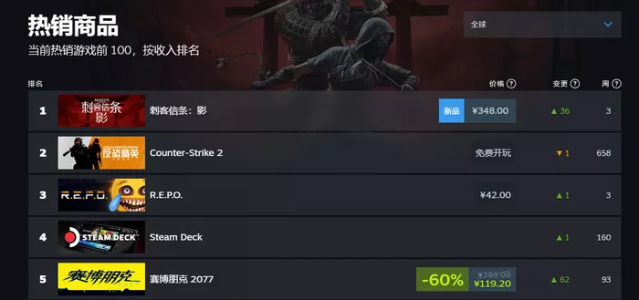 更为值得一提的是,在竞争激烈的全球游戏市场中,《刺客信条:影》凭借自身的卓越品质脱颖而出,一举登上全球热销商品榜首!它不仅超越了《CS2》、Steam Deck等长期占据热销榜前列的经典产品,还将近日爆火的在线合作恐怖游戏《R.E.P.O.》甩在身后,展现出强大的市场号召力。