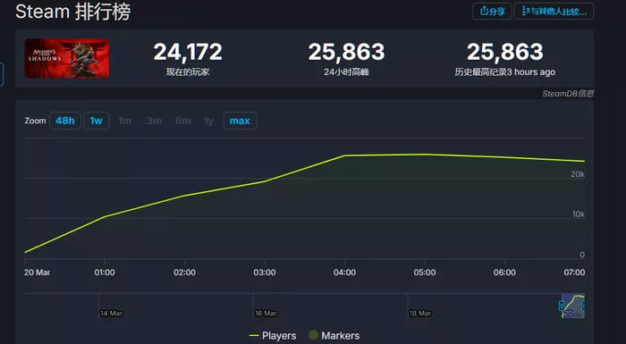 从SteamDB的数据来看,《刺客信条:影》在Steam平台上的表现堪称惊艳。其历史在线峰值已成功突破2.5万人,即便截至发稿时,仍有高达2.4万玩家沉浸在这款游戏的世界中,热度可见一斑。