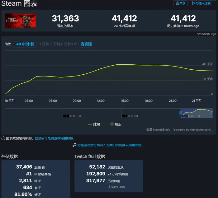 不过,根据Steamdb的数据,《刺客信条:影》目前24小时最高在线人数仅为41,412人,与2月底推出的《怪物猎人:荒野》最高138万人的成绩相比有不小差距。