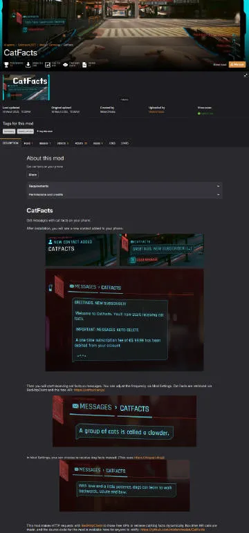自《赛博朋克2077》官方模组套件上线以来,社区已经出现了很多奇奇怪怪的模组。最近又有玩家推出了一个名为“CatFacts”(猫咪小知识)的模组,能够让玩家不定期收到关于猫咪的冷知识,接受频率可以自行调整,信息也将会自动删除。